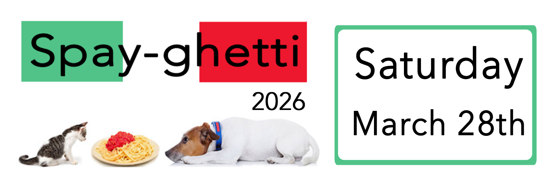 Save the date! Spay-ghetti 2026 will be held at Mitchell Senior Center in Ledger, on March 28th, from 4:30pm until 7pm! Dinners will be $10 (seniors), $12 (adults), $8 ( kids 12 & under) and include a choice of a vegan/gluten free pasta and sauce or spaghetti and meat sauce, a salad, bread, drink, and dessert (vegan and gluten free dessert options will also be available).